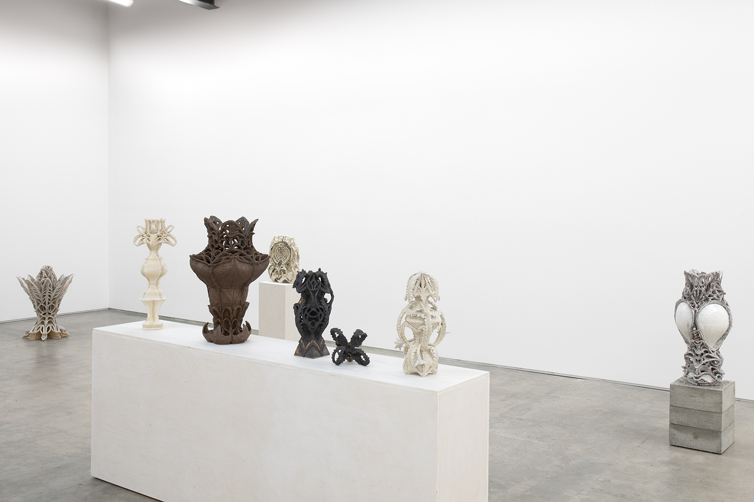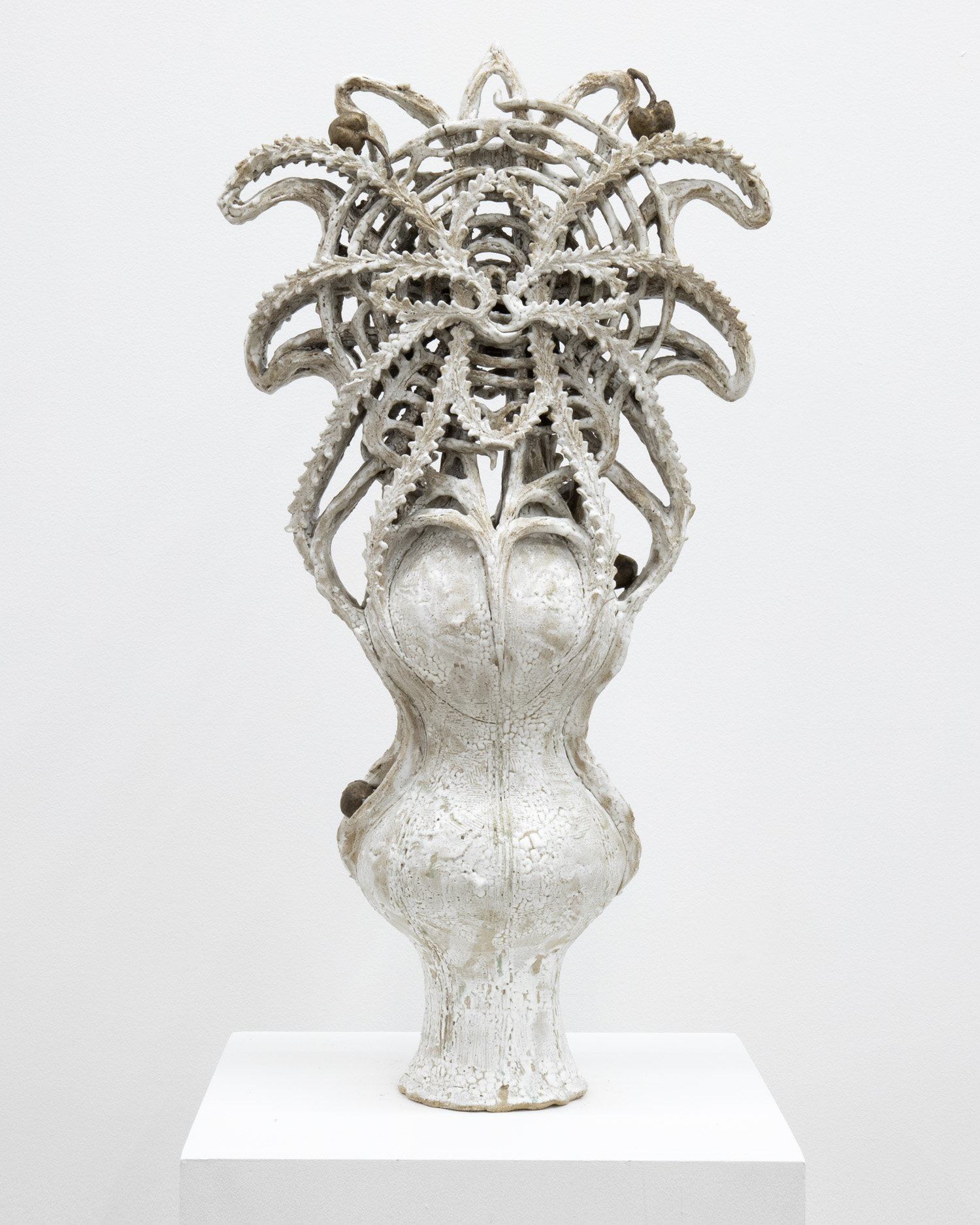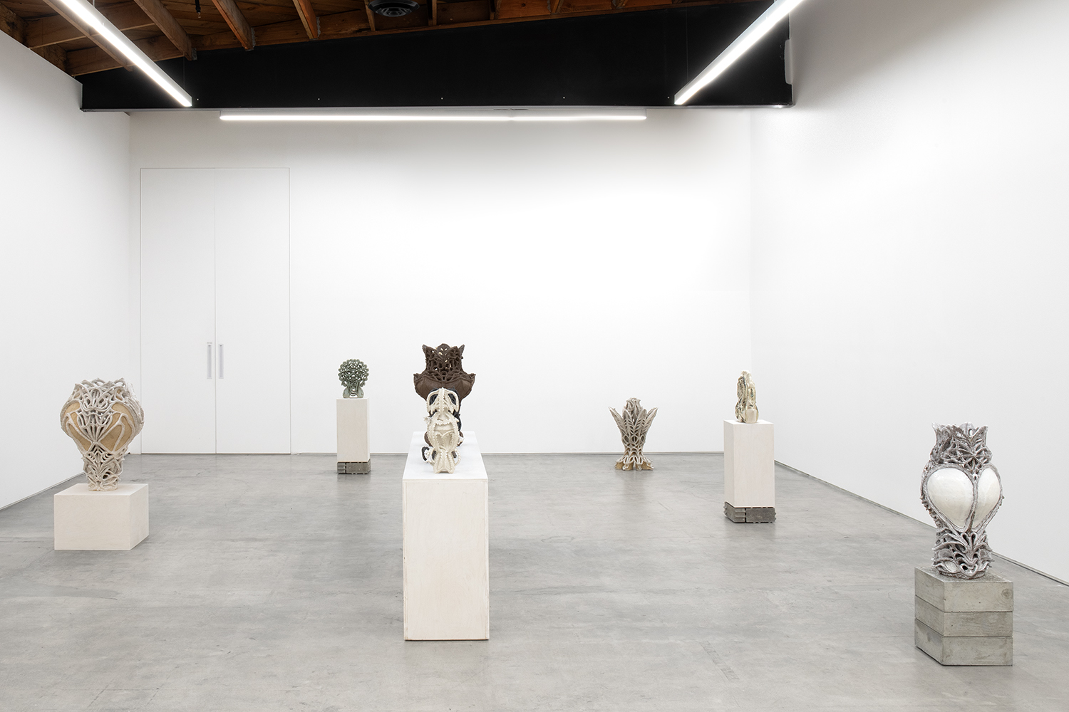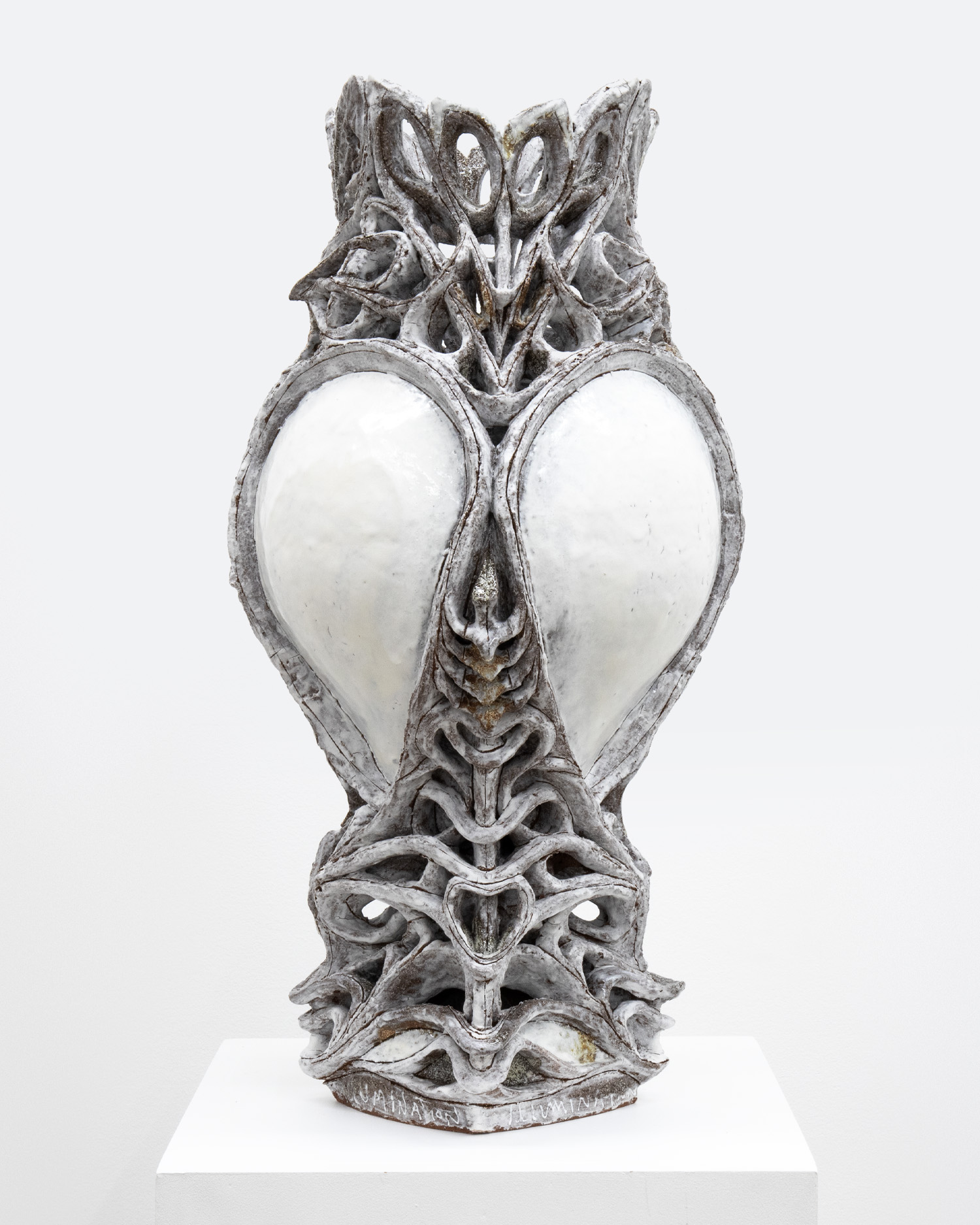 Morán Morán is pleased to present Pocket, Amelia Lockwood’s debut solo exhibition with the gallery. The exhibition unfolds as a constellation of ceramic sculptures arranged around a central table of jars and vessels. At first glance, the works appear to draw from the ornamental excess of the Rococo movement of the eighteenth century, characterized by elaborate surface detail, pastel palettes, and sinuous forms that spilled outward into space. Nature was rendered as decorative excess: vines, foliage, and mythological scenes meticulously depicted to suggest abundance, pleasure, and a distinctly human mastery over the natural world.