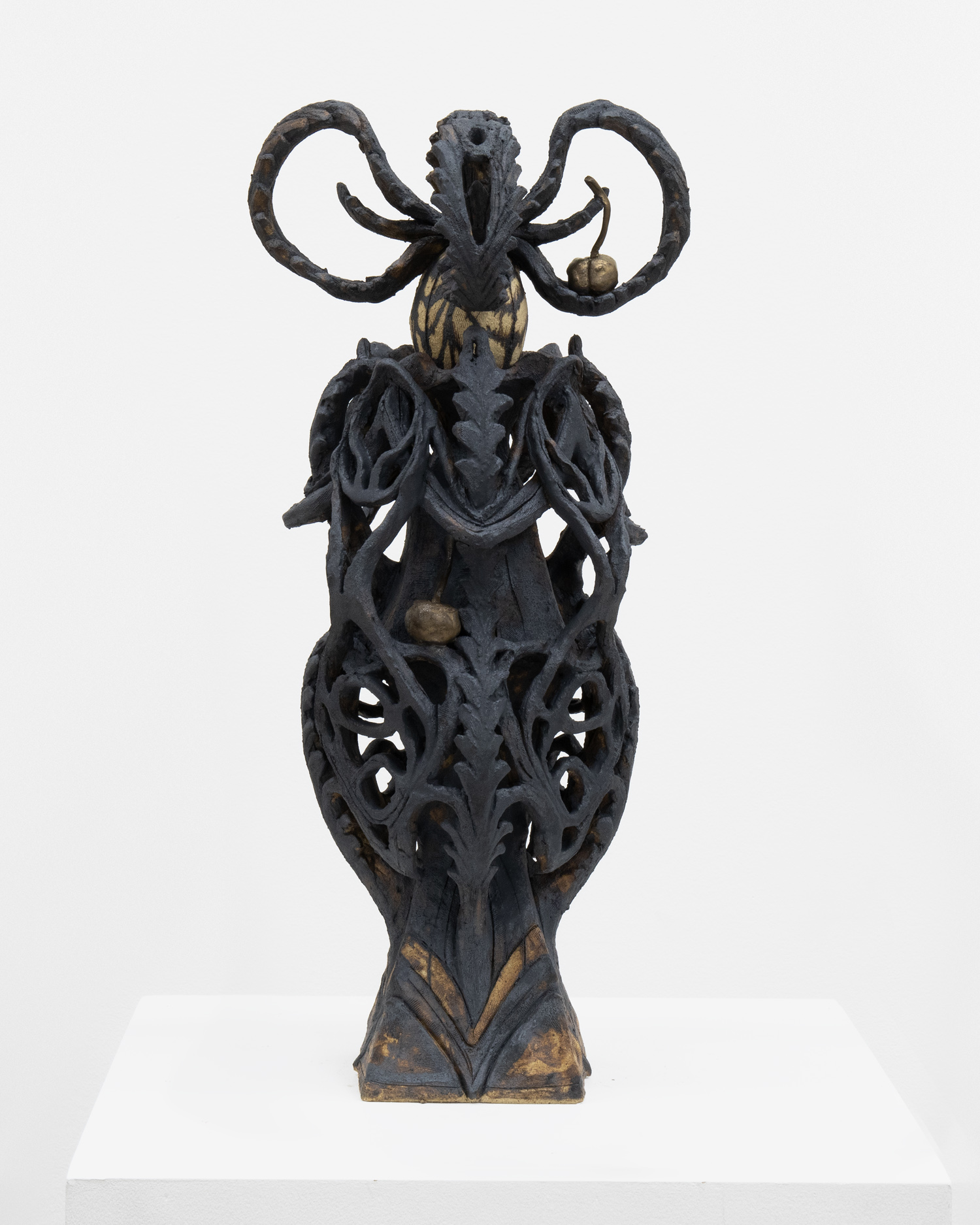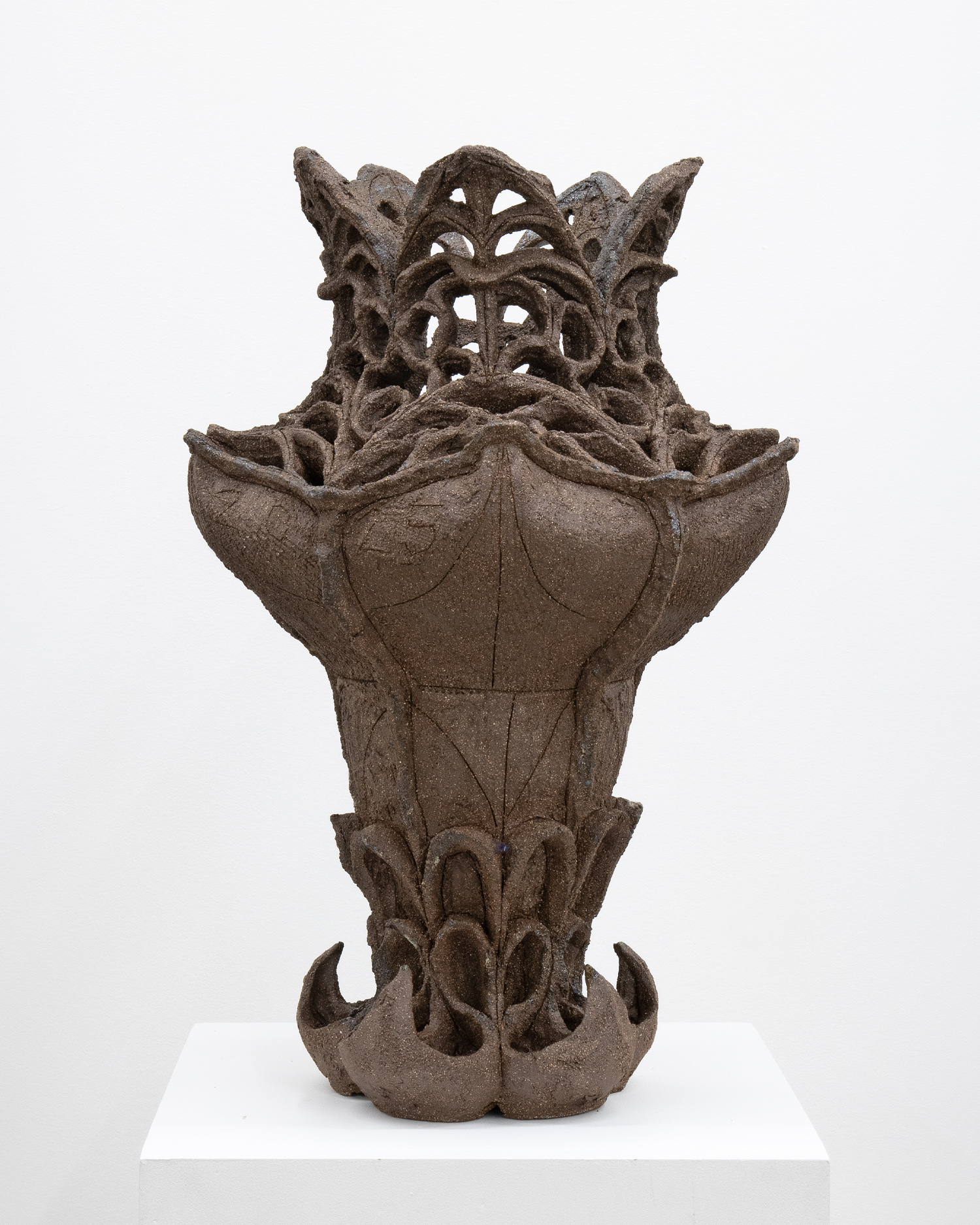 However, Lockwood engages this visual language only to quietly undo its hierarchy. Rather than gilded flourishes and airy coloration, her sculptures are grounded in a palette drawn directly from the earthen origins of the ceramic itself: burnt reds, muted browns, and ashen grays. Gold is stripped of its decorative predominance and replaced by glazes that emphasize time, weight, and tactility. These surfaces pulse with texture: coiling vines, clustered berries, and lattice-like structures emerge not as ornate gestures but as records of touch, pressure, and process. These forms foreground their material histories, emphasizing the clay’s connection to the environment from which it is extracted.